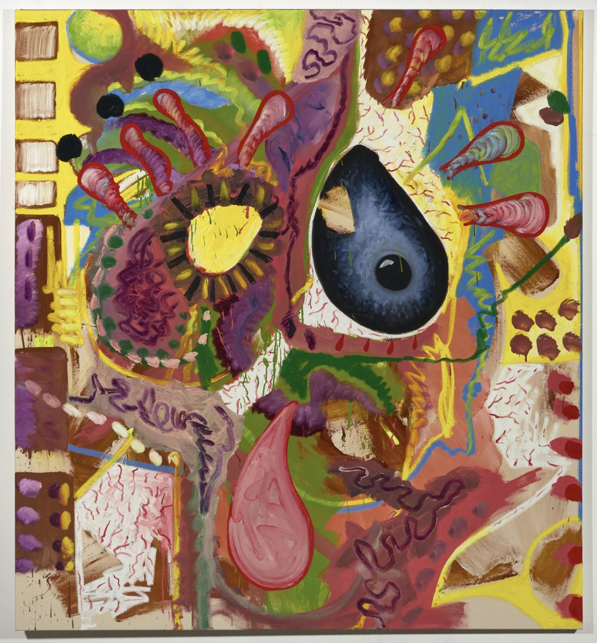 There’s a closeness to the surface, an openness to experience that I encountered through David’s work. Colours and shapes overlap and bounce off each other, eyeballs pop up. A cavalcade of characters appear across his body of work, routinely enough to be described as leitmotifs, such as skulls, cigarettes, eyeballs, with more abstract elements such as textured, surprising shapes, and purposeful, wobbly hand drawn curvilinear lines shaping and leading us around the world of the painting. In the push and pull between figuration and abstraction, the denseness of the imagery and the vibrancy of the colour choices overwhelmed me on first encounter. As I settle into a relationship with the work, the formal qualities reveal themselves to me, operating like a fluid, elastic framework from which hang traces of the cultural zeitgeist – coloured by David’s personal sensibility, such as in the artwork, The Second Lockdown, 2021, oil and resin on fabric on canvas, 150 x 450cm.