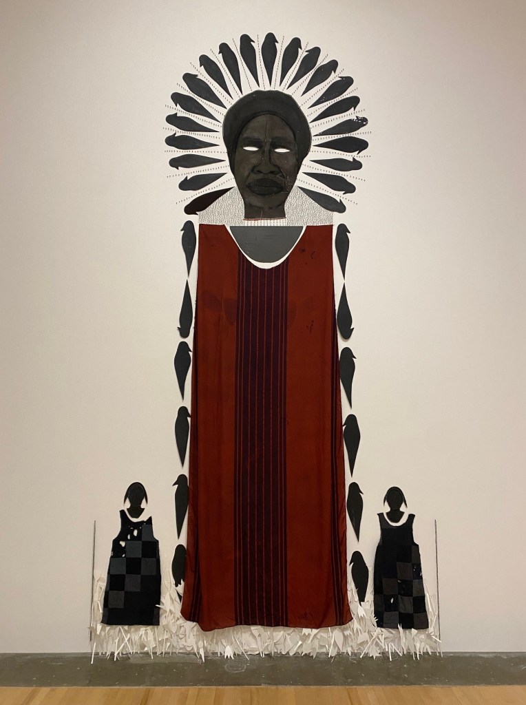 As a white woman encountering these works, I recognise that I stand outside the lived experiences of black women. I also recognise my own earnestness to hold space for the work to tell its’ own tale. As a woman – the references to body, to community, to familial ties resonate with elements of my own lived experience. The over life-sized scale of many of the works present these bodies as more than human, larger than life, they hold their own space and appear to hold their own counsel – is that because what we are looking at is the husk, the mask and costume steeped in history that’s been removed and left behind as an historical cultural artifact? To see the exhibition – is to be in the process of witnessing – an active verb in the present tense. I am left grappling with the questions: What am I witnessing? What is my responsibility as a witness? Or are the works themselves doing the witnessing and I am the subject/object of the act of witnessing?