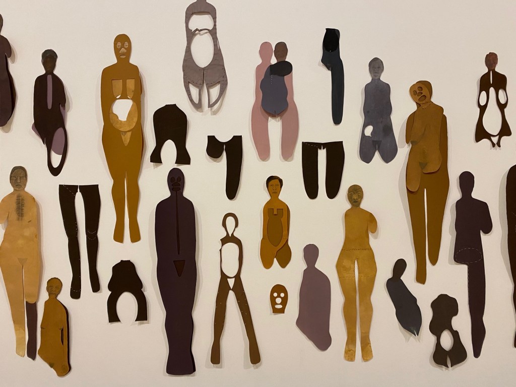 The first time I visited Alicia Henry’s Witnessing, I was continually overcome, immersed in what I read in the work as the intergenerational trauma of black African American women. Henry’s figurative works are undoubtedly potent – redolent of blood and bandages with an elegant mend and make do attitude, a high aesthetic sensibility and an unflinching determination to disrupt and disturb cultural representations and narratives. The bodies of work in Witnessing, based mostly on black, female bodies and faces made from paper, cardboard, leather, felt, fabric and more, hold the wall like … what? Can you answer that? What do they make you think of? Are they Effigies? Icons? Black Madonna’s? Vestments? Last season’s clothes? Outdated stereotypes? Shed skins…? If they are masks, are they theatrical, ritual or personal in nature? One thing is for sure – they are layered. Materially and metaphorically.