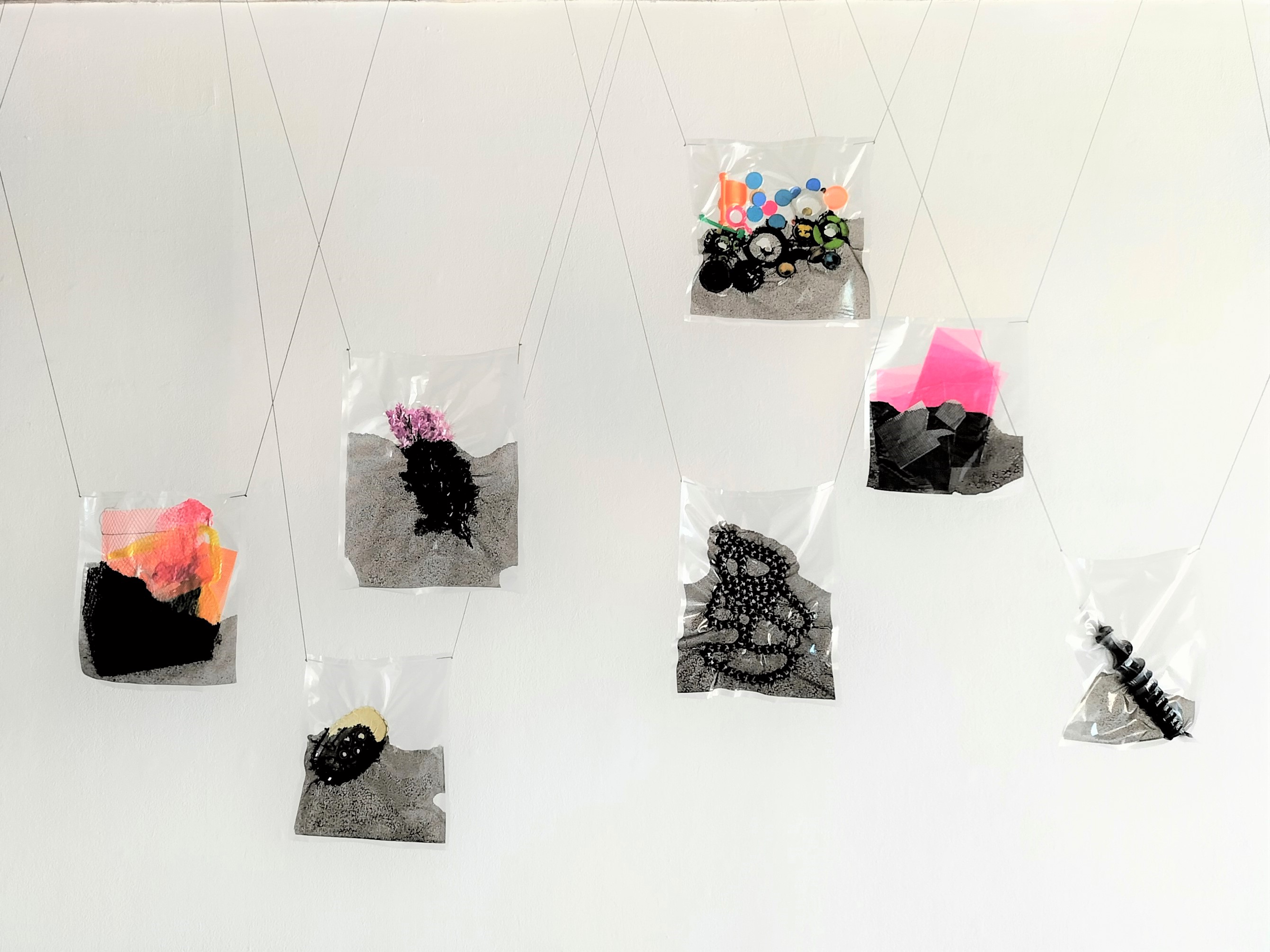 The tension between the formal qualities of the cotton strings cutting through the space in an elegantly repetitive, engineered fashion and the oddly beautiful, yet slightly abject quality of the objects in their airless, plastic pockets – created an aesthetic dissonance that evoked for me: the sadness of unfulfilled promises … a feeling of ennui … an evocation of a state of melancholy … a profound sense of disappointment as the found objects cut free from their purpose seek to reorientate themselves to their new place in the world. I find it breath-taking when I hear my emotional response to the work and my recent state of mind, suspended in the title, Items of hope and disappointment: expired inspiration (series) 2023. I too, recently lost a parent, my mum died in May last year, and I am still in the process of bereavement. I wonder what made me particularly receptive to honouring this specific work, one Sunday afternoon at an artist run gallery on the edge of Parramatta Road. Is it my recent wounding that made me more open to the work or was it Paris’s words that brought me closer. Or, equally possible, was it the thoughtful and generative conversation I had with Harry before the artists talk began that allowed me to honour the exchange with my attention. I have written previously on Joan Retallack’s concept of poethics, that suggests that some ideas can be most ethically reached towards through creative forms, and that these forms are singular and irreducible and ultimately ungraspable in their entirety. Is it the challenge of drawing moving fragments into creative forms that helps us to approach and remain alive to … ideas that matter. Indeed, Retallack suggests that some ideas cannot be expressed any other way than creatively, be that in poetry, visual art, music, or the dramatic arts, (Link to my previous essay on Poethics)