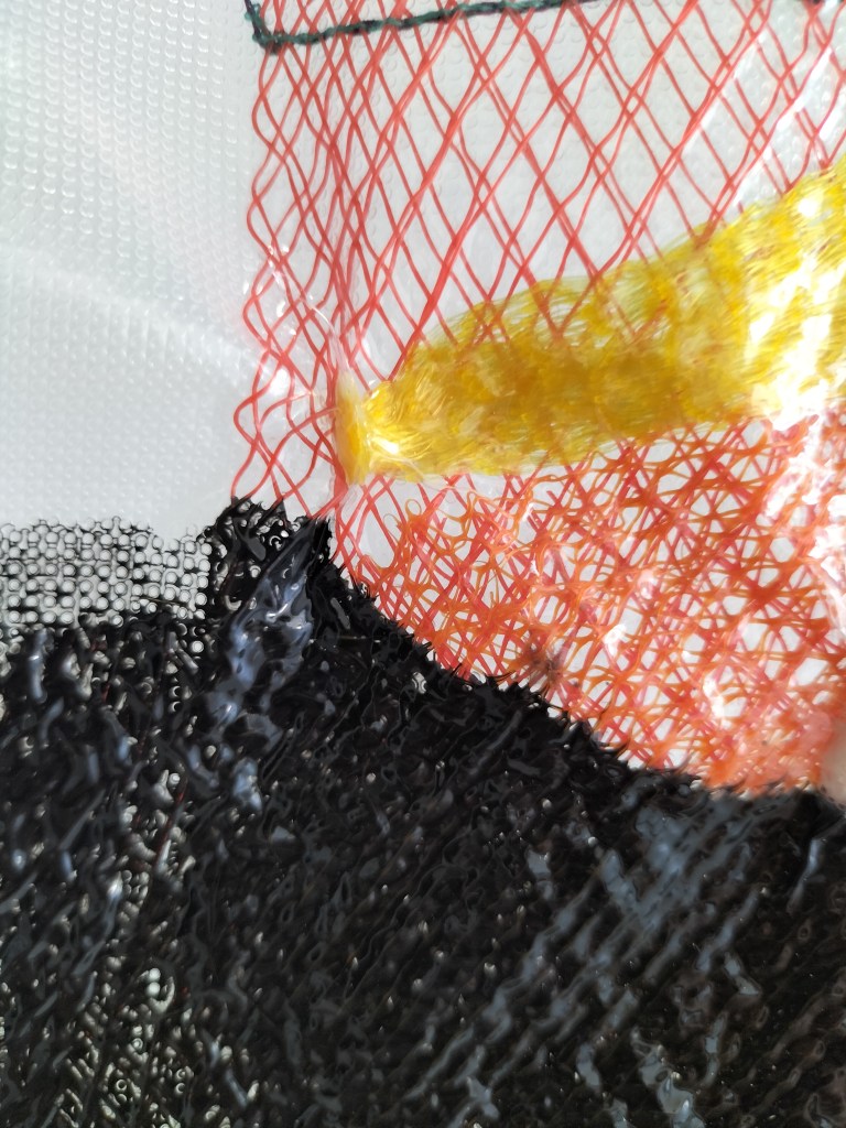 Paris as I’ll continue to call her for a while, until reading the room sheet corrects me, was both a curator and an exhibiting artist. I find it reassuring that I am open to correction – some people aren’t. Paris’ s work, Items of hope and disappointment: expired inspiration (series) 2023, was made of found objects. Items that prior to being vacuum sealed into plastic bags, along with black acrylic paint and suspended from waxed cotton strings, had been lovingly collected (I imagine) and carefully stored in her studio (she told us) awaiting their reincarnation and transformation as part of an artwork. The wires that held the transparent bags aloft made a pleasing formal composition of V shaped straight lines. The odd everyday objects, shrink wrapped inside the clear plastic, become elegiac in their suspended and still transforming state as the paint, ever so slowly, continues to move.