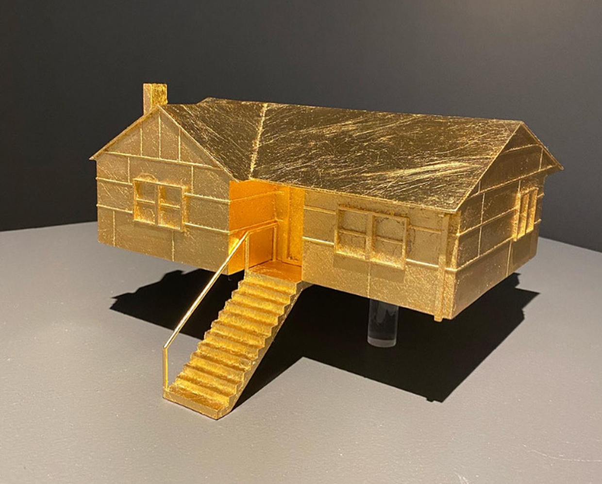 Catherine O’Donnell, Gold leafed house number 5, 2022, , from the Golden House series, stereolithographic model and gold leaf, 14 x 25 x 20 cm, Courtesy the artist