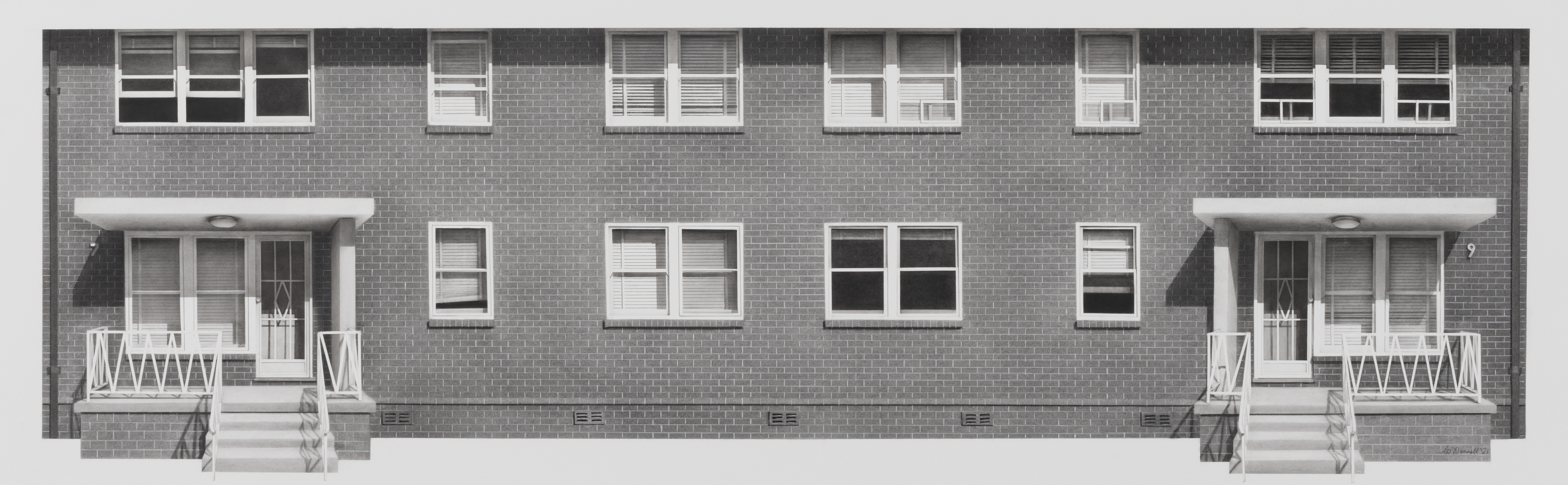 O’Donnell draws with not only a fastidious attention to detail, but with a loving and deeply thoughtful attention to detail. Her works while clearly representational, are never photorealistic. Catherine is drawn to the underlying geometry of her subjects, be that suburban carparks or social housing. As a child and young adult, Catherine lived in Green Valley, and recounts that she always loved the geometry of the fibro panels, a ubiquitous material in the low-income housing development her childhood memories are framed by.