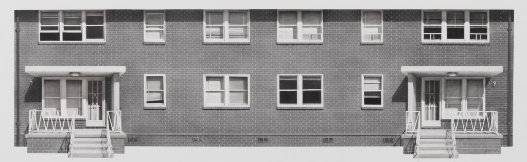 Take away all the social, cultural, and political references that fibro conjures up and what her artists eye sees is the elegance of the geometric forms. Whilst she draws realistically with razor-sharp attention to detail, such as counting the bricks in the block of flats that were the subject for Still lives (see below). She also often removes extraneous details like rooves and piers, which has the effect of displacing these buildings from their immediate environment and allowing the essential geometric forms wrapping around the facade of the building to remains the hero.